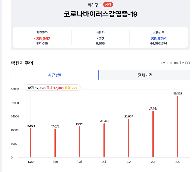 오미크론 확산 가속..2만명대 진입 사흘만에 3만명대 넘어 경기 1만449명-서울 8천598명..수도권만 2만1천547명 코로나19 오미크론 변이의 급속 확산으로 연일 확진자가 가파르게 증가하는 가운데 5일 신규 확진자 수가 3만명을 넘어섰다. 중앙방역대책본부는 이날 0시 기준으로 확진자가 3만6천362명 늘어 누적 97만1천18명이라고 밝혔다. 신규 확진자 수는 지난달 26일(1만3천9명) 처음 1만명을 넘어선 뒤 일주일만인 지난 2일(2만269명) 2만명대로 올라섰다. 이후 증가세에 속도가 붙으면서 2만명대에 진입한 지 불과 사흘 만에 3만명선까지 넘어섰다. 전날(2만7천443명)과 비교하면 8천919명 폭증했다. 전일 대비 증가폭도 전례 없는 수준으로 급격히 커진 것이다. 신규 확진자수는 1주 전인..